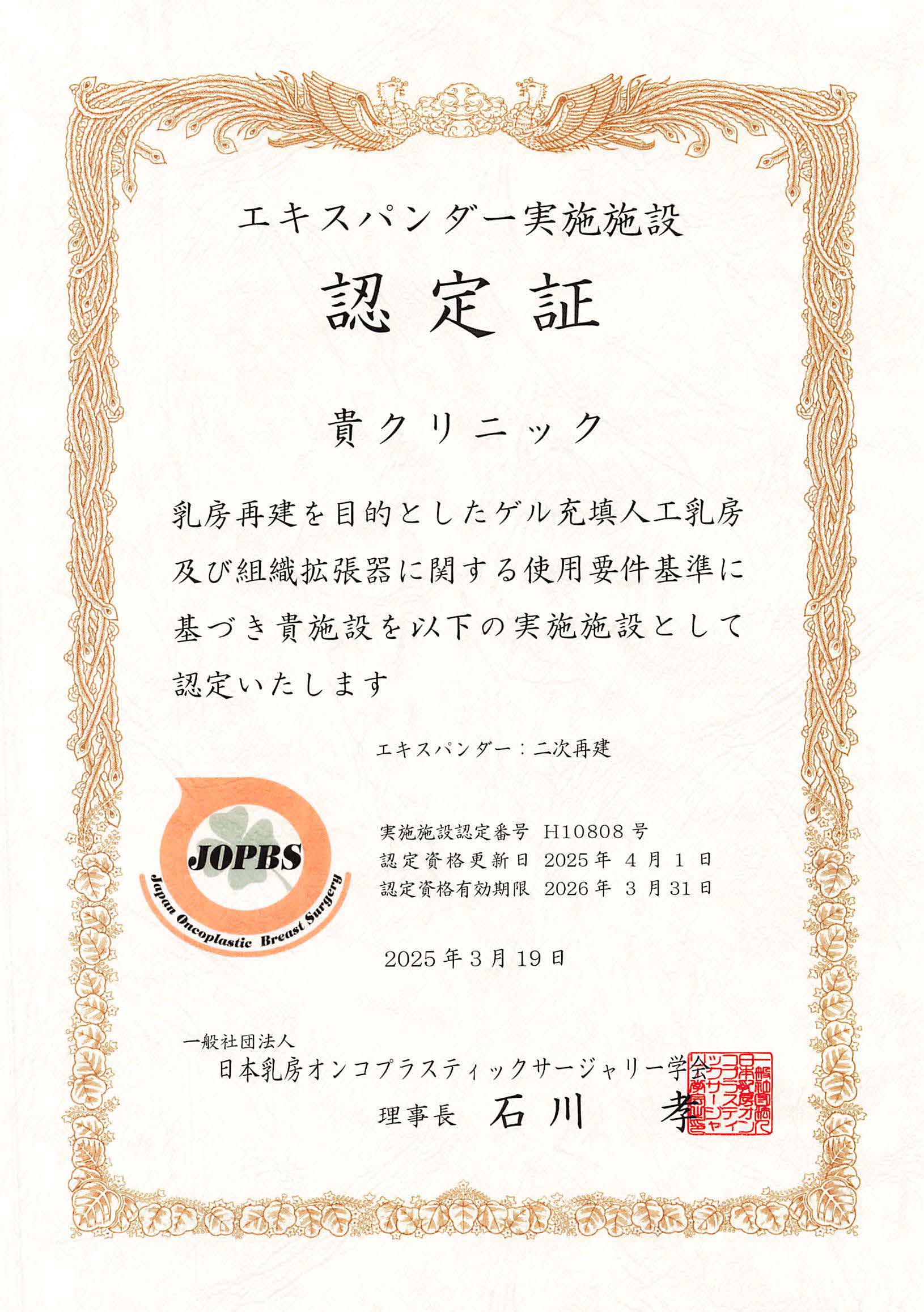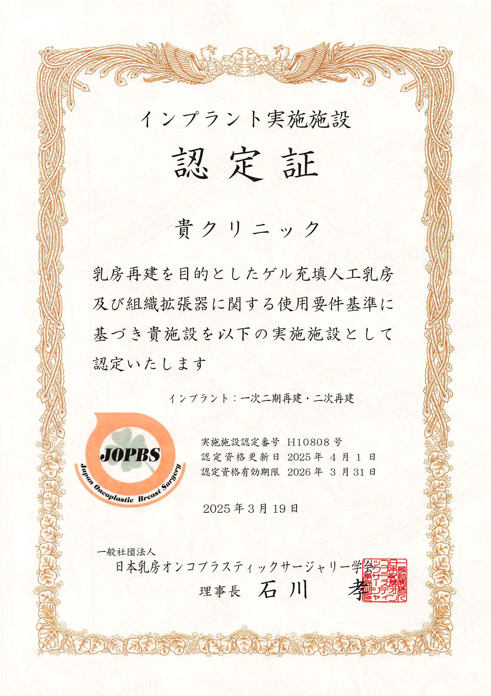 ● 当施設は乳がんの術後再建を目的としたエキスパンダー及びインプラント(ゲル充填人工乳房)実施施設です