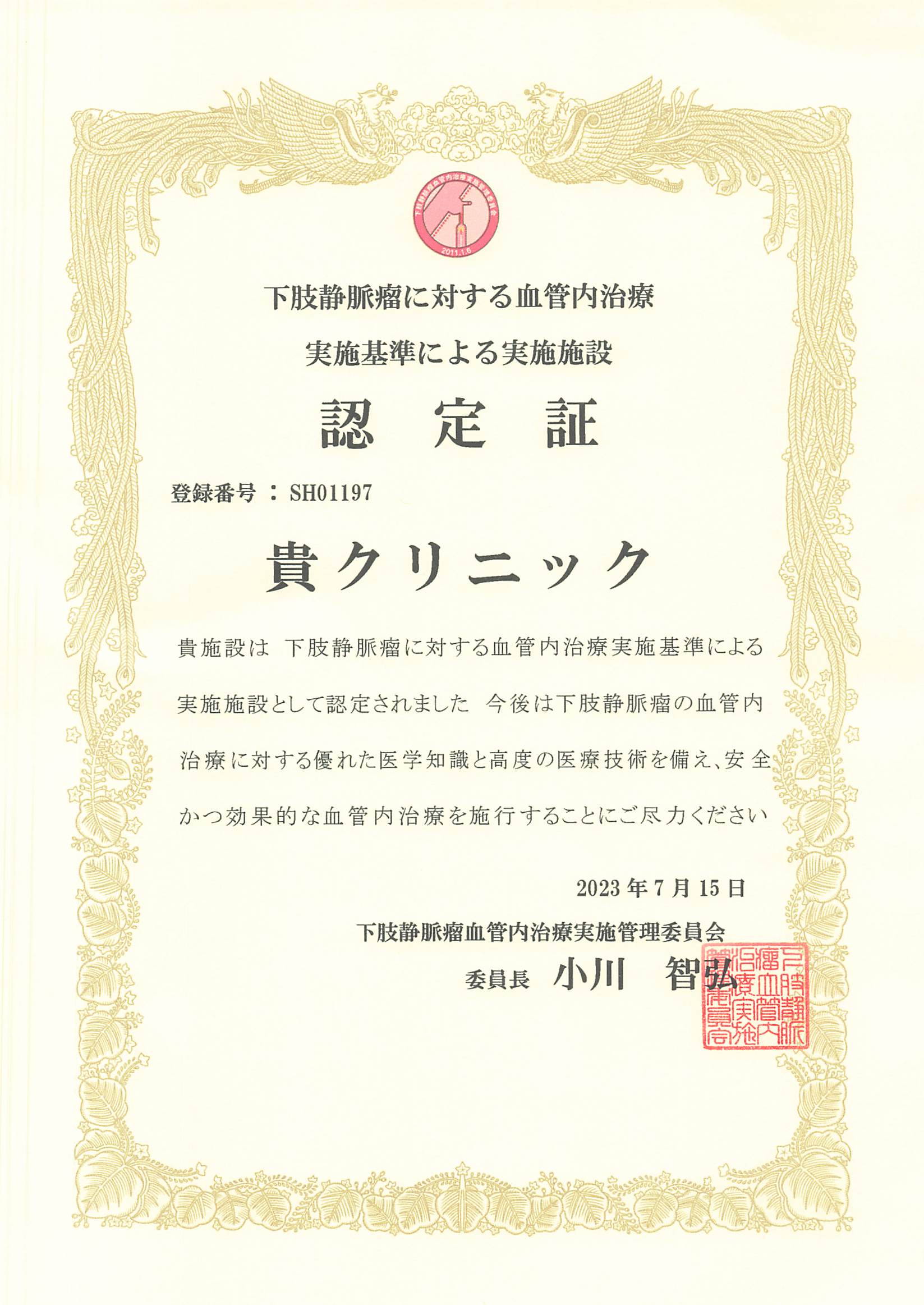 ● 下肢静脈瘤に対する血管内治療実施基準による実施施設の認定を受けております。